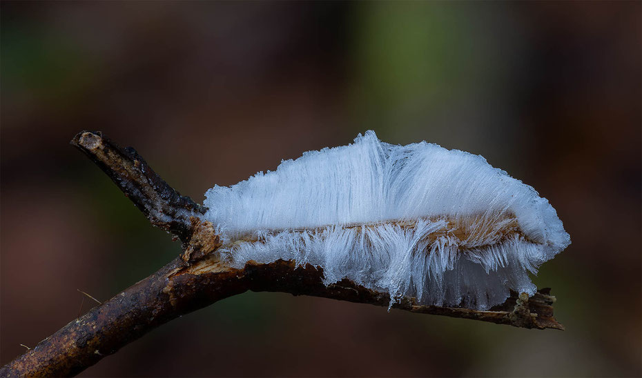 Anders als zum Beispiel Raureifkristalle entsteht Haareis aus dem im Holz enthaltenen Wasser, nicht aus Luftfeuchtigkeit.