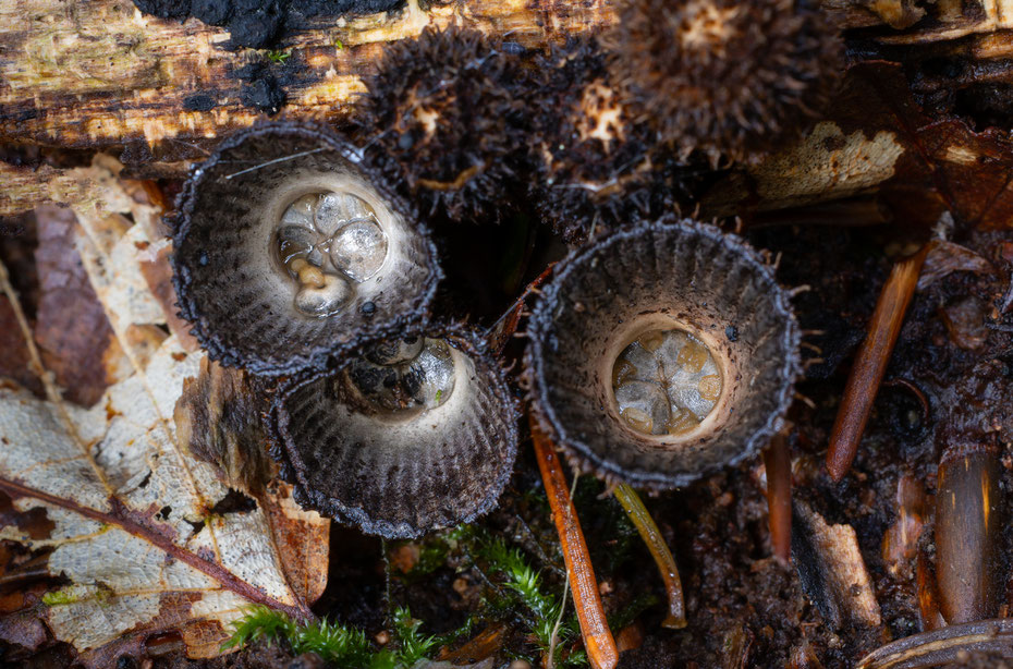 Sie besiedeln Holz, auch Rindenmulch, Holzchips sowie Sägemehl. Gemäßp einer aktuellen Theorie veranstalten sie eine Art „Samenmimikri“: Vogel pickt einen der linsenförmigen Sporenbehälter auf, erkennt ihn als ungenießbar und schleudert ihn anschließend weg. Somit gelangt er an einen anderen Platz, an dem die Sporen keimen können. Das ist mindestens ebenso plausibel, wie der jahrzehntelang durch die Literatur geschleifte Regentropfen, der die Linsen zum gleichen Zweck herausspült.